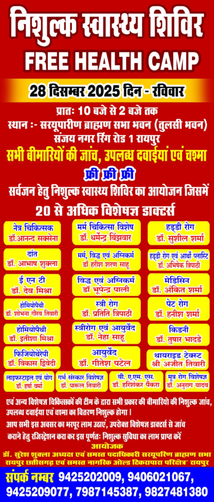 रायपुर, 26 दिसंबर। Free Health Camp : सरयूपारिण ब्राह्मण सभा छत्तीसगढ़ द्वारा प्रति वर्ष की भांति इस वर्ष भी सर्वजन हेतु निःशुल्क स्वास्थ्य शिविर का आयोजन 28 दिसंबर, रविवार को किया जा रहा है। यह शिविर तुलसी भवन, संजय नगर, रिंग रोड नंबर-1 में आयोजित होगा। उक्त जानकारी सभा के अध्यक्ष डॉ. सुरेश शुक्ला ने दी।