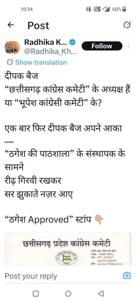 उन्होंने आगे आरोप लगाया कि एक बार फिर दीपक बैज अपने ‘आका’ के सामने सिर झुकाते नजर आए हैं। राधिका खेरा के इस बयान के बाद प्रदेश की सियासत में हलचल तेज हो गई है और कांग्रेस के भीतर चल रहे आंतरिक मतभेदों पर भी सवाल खड़े हो रहे हैं।