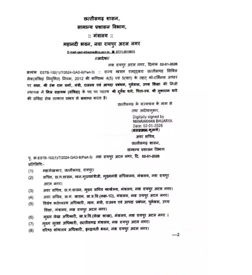 रायपुर, 03 जनवरी। Official Notification : छत्तीसगढ़ शासन, सामान्य प्रशासन विभाग ने राज्य शासन की संविदा सेवा नियम, 2012 के तहत दुर्गेश धारे की संविदा सेवा तत्काल प्रभाव से समाप्त करने का निर्णय लिया है।