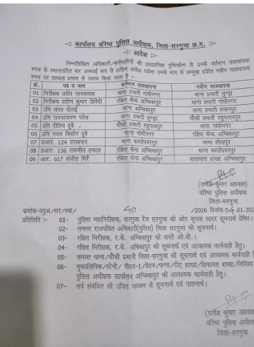 तबादला आदेश के अनुसार निरीक्षक प्रदीप जायसवाल को लुण्ड्रा थाना प्रभारी बनाया गया है, जबकि निरीक्षक प्रवीण कुमार द्विवेदी को गांधीनगर थाना प्रभारी की जिम्मेदारी सौंपी गई है। अन्य पुलिसकर्मियों को भी अलग-अलग थानों और शाखाओं में नई पदस्थापना दी गई है।