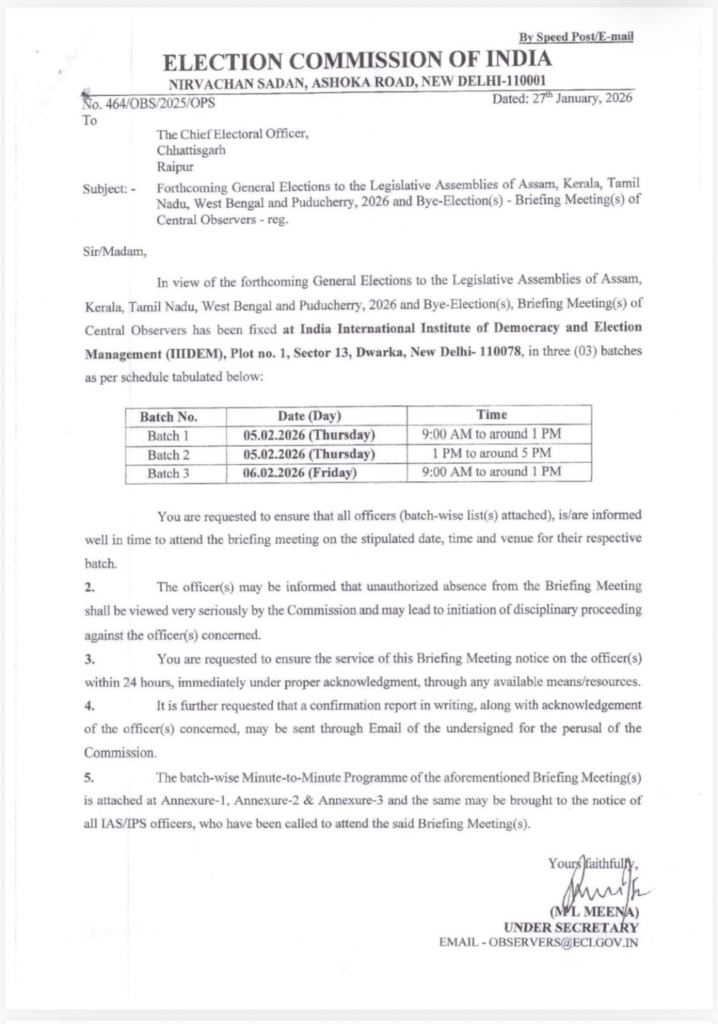 चुनाव आयोग के अनुसार यह ब्रीफिंग मीटिंग तीन बैचों में आयोजित की जाएगी। आयोग ने सभी अधिकारियों को अपने निर्धारित बैच के अनुसार तय समय और स्थान पर उपस्थित रहने के निर्देश दिए हैं। साथ ही यह भी स्पष्ट किया गया है कि बिना वैध कारण अनुपस्थित रहने पर अनुशासनात्मक कार्रवाई की जा सकती है।