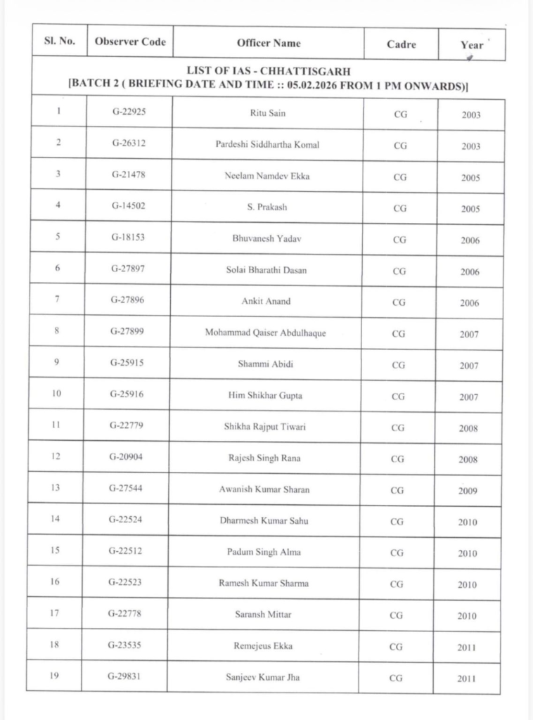 रायपुर, 28 जनवरी। Election Commission : भारत निर्वाचन आयोग ने आगामी विधानसभा चुनावों और उपचुनावों को ध्यान में रखते हुए राज्य के 25 आईएएस और 5 आईपीएस अधिकारियों को केंद्रीय चुनाव पर्यवेक्षक के रूप में नियुक्त किया है। इन अधिकारियों के लिए 5 और 6 फरवरी को नई दिल्ली में विशेष प्रशिक्षण (ब्रीफिंग मीटिंग) आयोजित की जाएगी।
