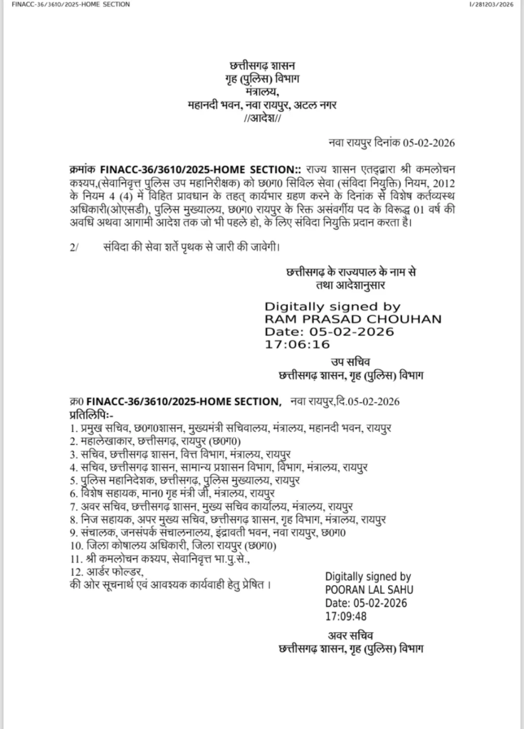 आदेश के अनुसार, कमलोचन कश्यप को छ0ग0 सिविल सेवा (संविदा नियुक्ति) नियम, 2012 के नियम 4(4) के तहत संविदा पर कार्यभार सौंपा गया है। उन्हें पुलिस मुख्यालय, रायपुर के रिक्त असंवर्गीय पद पर 1 वर्ष की अवधि या आगामी आदेश तक, जो भी पहले हो, के लिए OSD के रूप में नियुक्त किया गया है। इस नियुक्ति के साथ कमलोचन कश्यप अब छत्तीसगढ़ पुलिस मुख्यालय में विशेष कर्तव्य निभाएंगे।