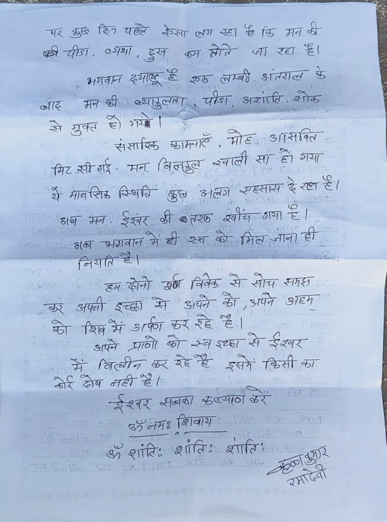 इस सुसाइड नोट में उन्होंने अपने बड़े भाईयों से आदित्य के क्लेम का पैसा दिलवाने की बात भी कही, और परिवार से यह अपील की कि वे उन्हें शोक के बजाय खुशी के साथ विदाई दें। यह परिवार के लिए एक काला दिन साबित हुआ जब 18 अक्टूबर 2025 को आदित्य की मौत हुई, और उस दिन से ही दोनों माता-पिता मानसिक रूप से टूट गए थे।