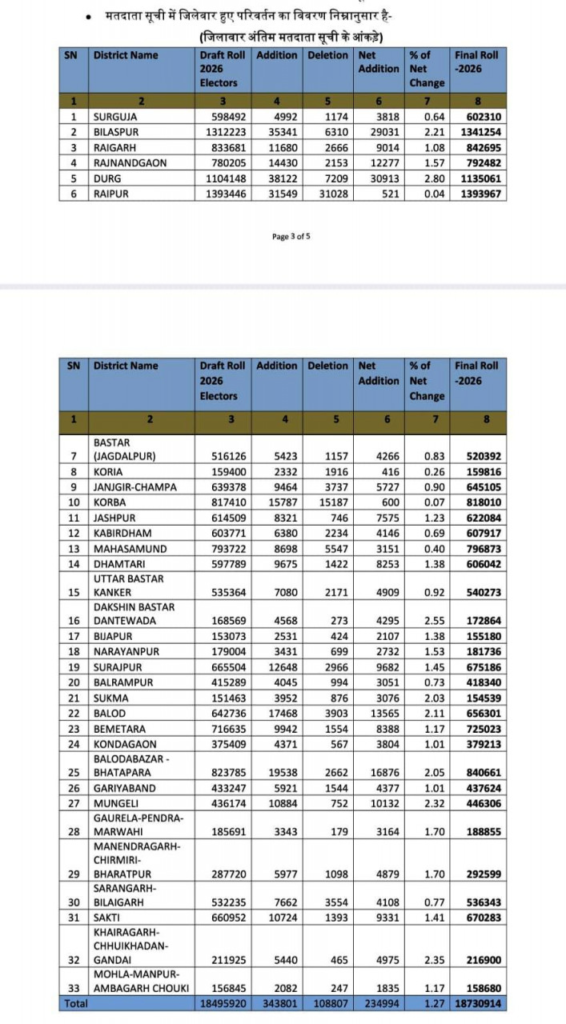 रायपुर, 21 फरवरी। Election Commission of India : भारत निर्वाचन आयोग, नई दिल्ली के निर्देशानुसार छत्तीसगढ़ राज्य में निर्वाचक नामावलियों का विशेष गहन पुनरीक्षण (एसआईआर) अभियान शुरू किया गया है। राज्य भर में दिनांक 27 अक्टूबर 2025 से शुरू हुए और चार महीने तक लगातार चले एसआईआर (विशेष गहन पुनरीक्षण) अभियान के विभिन्न चरणों के प्रभावी संचालन के बाद आज दिनांक 21.02.2026 को निर्वाचक नामावली की अंतिम प्रकाशन किया गया। मतदाता सूची में अपना नाम शामिल कराने, मतदाता सूची से अपना नाम हटवाने या प्रविष्टियों में संशोधन से संबंधित दावे और आपत्तियां दिनांक 23.12.2025 से 22.01.2026 के बीच प्रस्तुत किए गए थे। प्राप्त दावे आपत्तियों का निराकरण दिनांक 14 फरवरी 2026 तक किया गया।