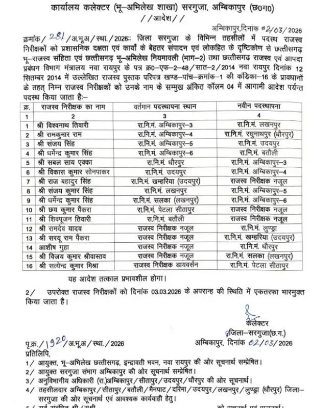 सरगुजा, 02 मार्च। CG RI Transfer : जिले के प्रशासनिक ढांचे में बड़ा फेरबदल करते हुए कलेक्टर ने विभिन्न तहसीलों में पदस्थ 16 राजस्व निरीक्षकों (RI) के तबादले के आदेश जारी कर दिए हैं। इस संबंध में आधिकारिक सूची भी जारी कर दी गई है।