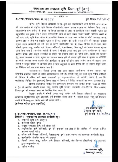 कलेक्टर अभिजीत सिंह ने बताया कि ग्रामीण कृषि विस्तार अधिकारी एकता साहू द्वारा कराए गए फसल प्रदर्शन में गंभीर लापरवाही सामने आई है। जिस स्थान पर प्रदर्शन प्लॉट होना था, उसके बजाय दूसरी जगह इसे दिखाया गया और किसान की फोटो भी सही तरीके से नहीं ली गई।