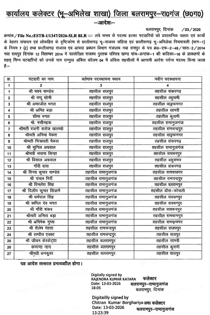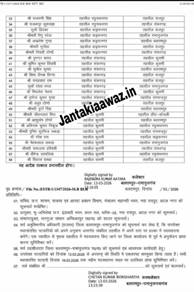 बलरामपुर, 15 मार्च। Transfer of Patwaris : बलरामपुर में अवैध अफीम की खेती के खुलासे के बाद प्रशासन ने सख्त कदम उठाया है। कलेक्टर राजेंद्र कुमार कटारा ने जिले में बड़े स्तर पर फेरबदल करते हुए एक साथ 58 पटवारियों का तबादला कर दिया है।