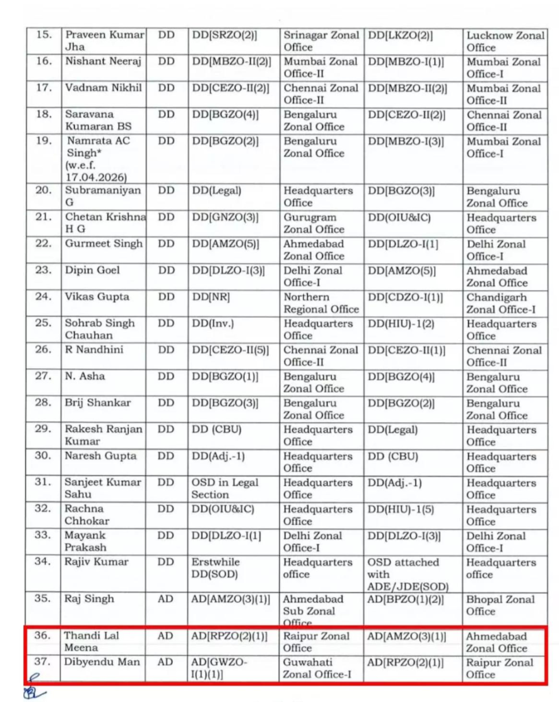 जारी आदेश के मुताबिक, रायपुर जोनल ऑफिस में पदस्थ सहायक निदेशक टीएल मीणा का तबादला अहमदाबाद कर दिया गया है। वहीं, गुवाहाटी जोनल ऑफिस से दिव्येंदु मान को रायपुर स्थानांतरित किया गया है।