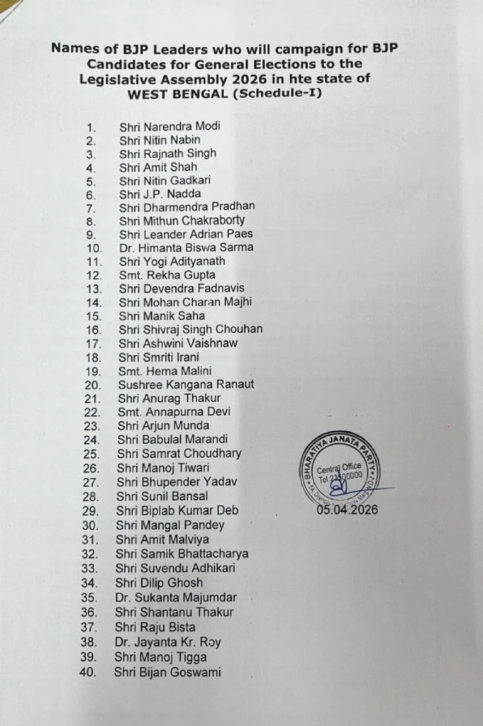 कोलकाता/कूच बिहार, 06 अप्रैल। Bengal Elections 2026 : पश्चिम बंगाल चुनाव 2026 को लेकर सियासी माहौल पूरी तरह गर्म हो चुका है। चुनाव प्रचार अपने चरम पर है और इसी बीच BJP ने अपने 40 स्टार प्रचारकों की सूची जारी कर दी है। इसी के साथ प्रधानमंत्री मोदी ने कूच बिहार से चुनावी अभियान की शुरुआत कर दी है, जिससे राज्य में हाई-वोल्टेज प्रचार का आगाज हो गया है और सियासी मुकाबला और भी दिलचस्प हो गया है।