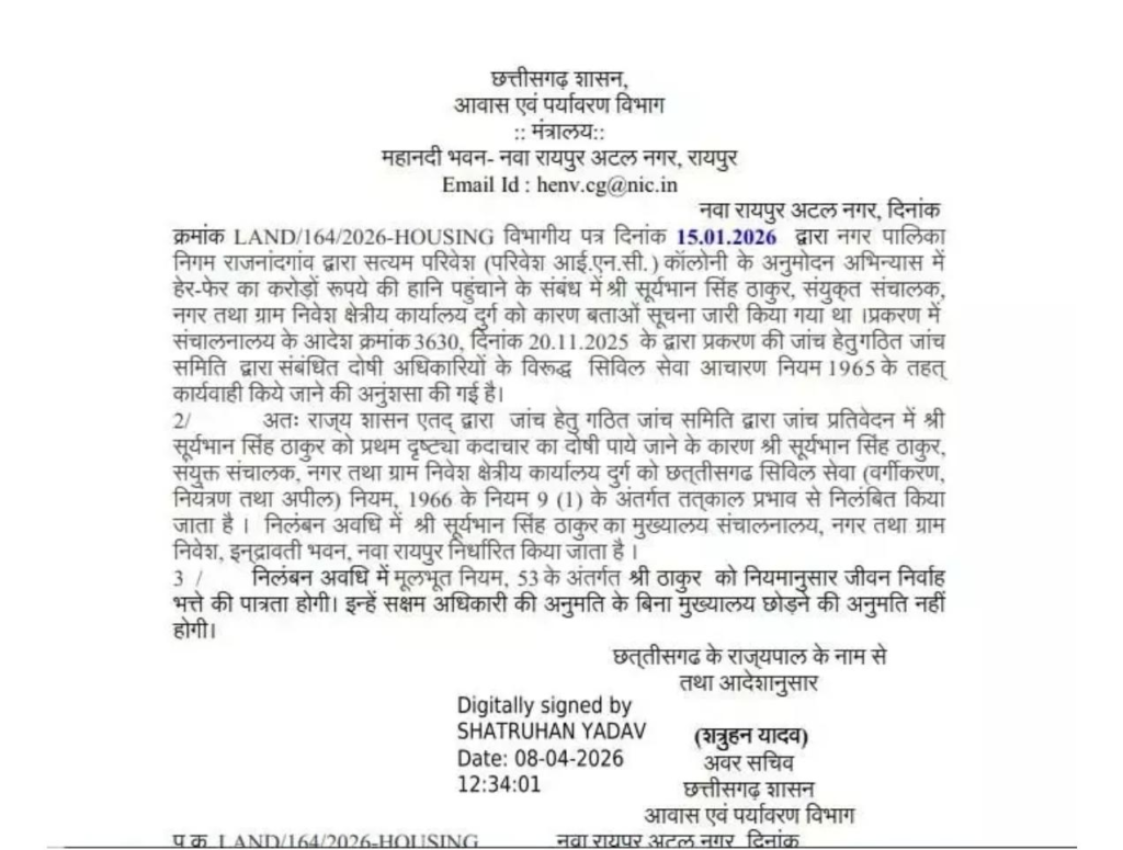निलंबित अधिकारियों में ज्वॉइंट डायरेक्टर सूर्यभान सिंह ठाकुर और डिप्टी डायरेक्टर कमला सिंह शामिल हैं। दोनों पर राजनांदगांव स्थित सत्यम परिवेश कॉलोनी के अनुमोदन में कथित हेर-फेर करने का आरोप है।