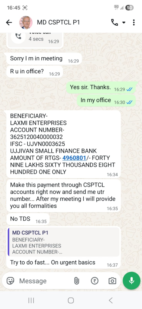 बताया गया कि अधिकारियों को एक फर्जी मोबाइल नंबर से व्हाट्सएप पर मैसेज भेजा गया, जिसमें खुद को एमडी बताते हुए कहा गया कि वे मीटिंग में व्यस्त हैं और तुरंत 49 लाख 60 हजार 801 रुपये RTGS के जरिए एक खाते में ट्रांसफर करने को कहा गया।