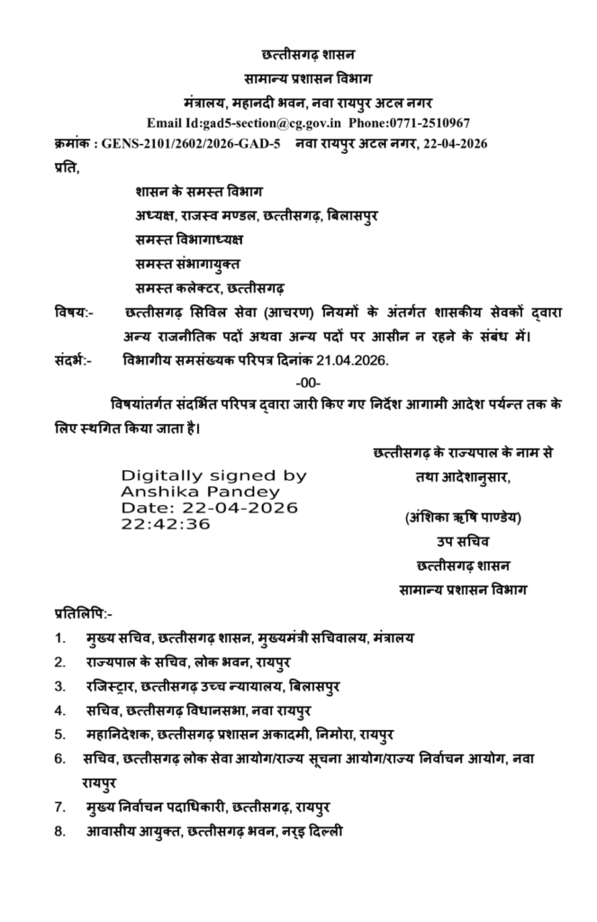 इसके साथ ही बिना सक्षम अधिकारी की अनुमति के किसी भी संस्था, समिति या संगठन में पद धारण करने पर भी रोक लगाई गई थी। सरकार ने यह भी कहा था कि कर्मचारी ऐसा कोई दायित्व स्वीकार नहीं करेंगे, जिससे उनकी निष्पक्षता प्रभावित हो। नियमों के उल्लंघन पर छत्तीसगढ़ सिविल सेवा (वर्गीकरण, नियंत्रण एवं अपील) नियम, 1966 के तहत कड़ी कार्रवाई की चेतावनी दी गई थी।