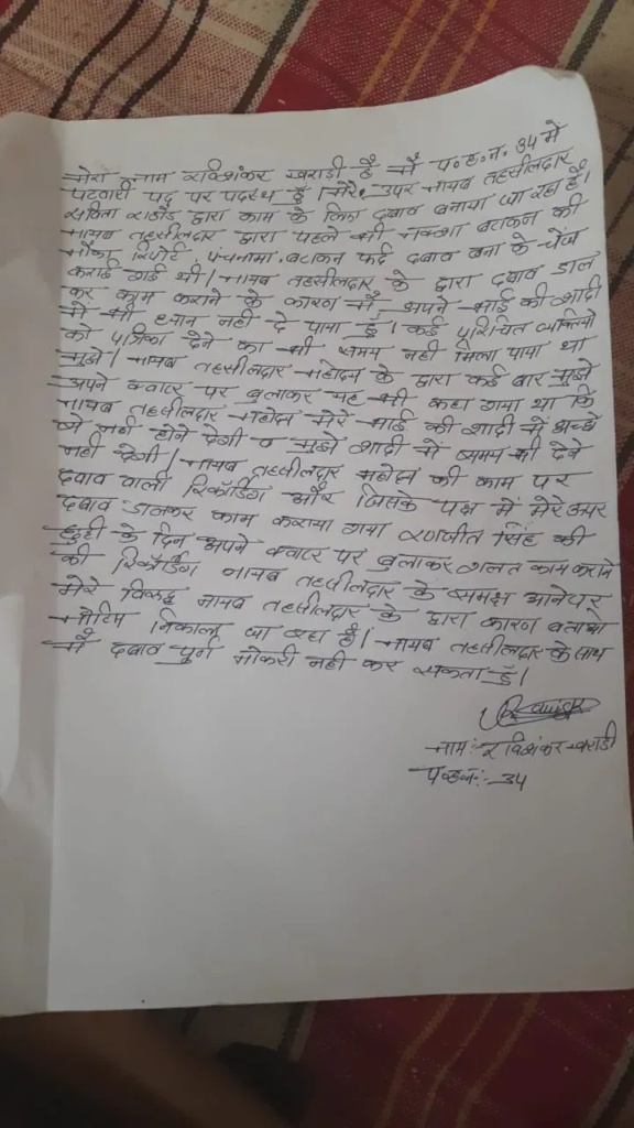 बताया जा रहा है कि पटवारी रविशंकर खराड़ी ने 21 अप्रैल को फांसी लगाकर आत्महत्या (Patwari Suicide) कर ली थी। प्रारंभिक जांच में सामने आया कि वह कार्य के दबाव और कथित प्रताड़ना से परेशान था।