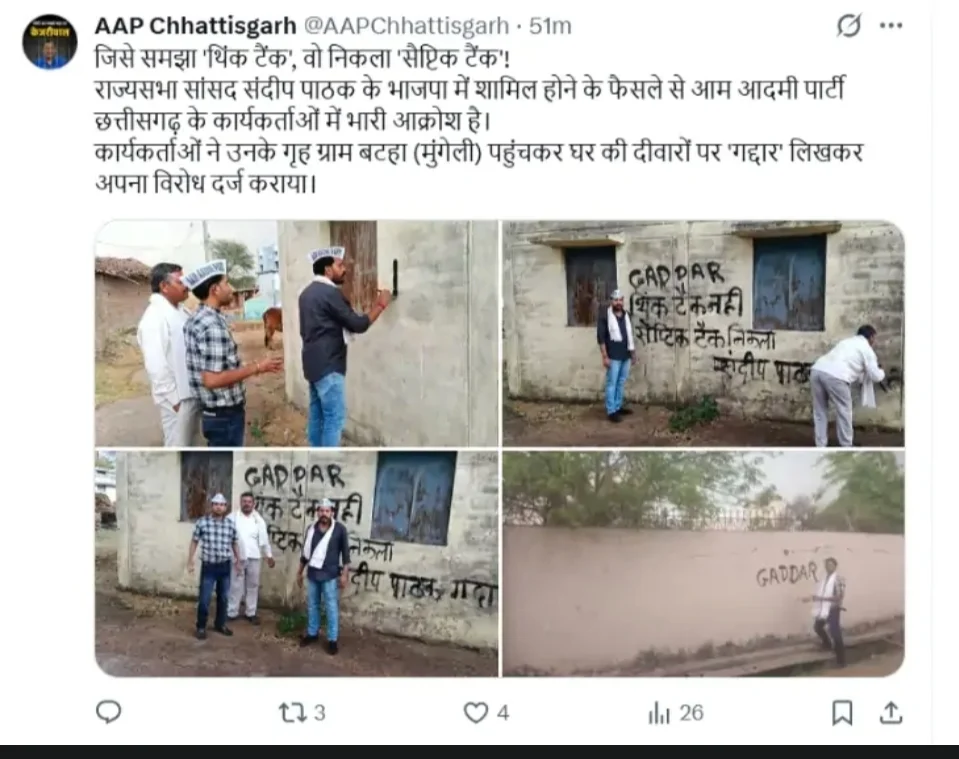 बताया जा रहा है कि हाल ही में उनके AAP छोड़कर भारतीय जनता पार्टी (BJP) में शामिल होने से नाराज कार्यकर्ता उनके बटहा स्थित घर पहुंच गए, जहां उन्होंने जमकर नारेबाजी की। प्रदर्शन के दौरान कार्यकर्ताओं ने घर की दीवार पर ‘गद्दार’ लिखकर अपना आक्रोश जाहिर किया। इस पूरे घटनाक्रम की तस्वीरें सोशल मीडिया प्लेटफॉर्म X (ट्विटर) पर भी साझा की गई हैं, जो तेजी से वायरल हो रही हैं।