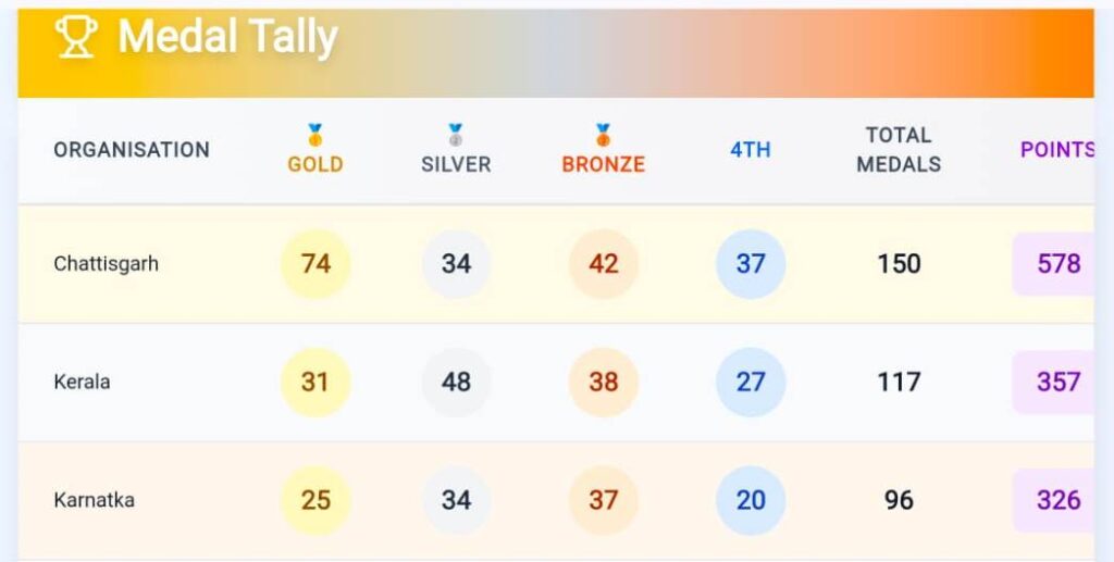 रायपुर, 16 नवम्बर। All India Forest Sports Competition : छत्तीसगढ़ ने अखिल भारतीय वन खेल प्रतियोगिता में एक बार फिर इतिहास रच दिया है। देहरादून में हुई 28वीं अखिल भारतीय वन खेल प्रतियोगिता में शानदार प्रदर्शन करते हुए मेडल तालिका में पहला स्थान हासिल किया है। इस प्रतियोगिता में छत्तीसगढ़ ने 150 मेडल और 578 अंक के साथ लगातार दूसरे वर्ष चैम्पियनशिप अपने नाम की है। मुख्यमंत्री विष्णु देव साय और वन मंत्री केदार कश्यप ने प्रतियोगिता में उत्कृष्ट प्रदर्शन करने वाले सभी खिलाड़ियों और टीमों को बधाई देते हुए उन्हें भविष्य में भी ऐसे ही उत्कृष्ट प्रदर्शन करने के लिए बधाई और शुभकामनाएँ दी है।
