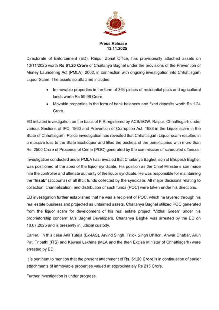 रायपुर, 13 नवम्बर। Big Action by ED : प्रवर्तन निदेशालय के रायपुर जोनल कार्यालय ने छत्तीसगढ़ के चर्चित शराब घोटाले की जांच के तहत पूर्व मुख्यमंत्री भूपेश बघेल के पुत्र चैतन्य बघेल की कुल ₹61.20 करोड़ की चल-अचल संपत्तियों को अस्थायी रूप से कुर्क किया है। यह कार्रवाई मनी लॉन्ड्रिंग निवारण अधिनियम (PMLA), 2002 के तहत की गई है।
