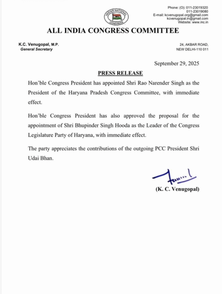 चंडीगढ़, 30 सितंबर। Big Change in Congress : हरियाणा कांग्रेस में लंबे समय से चल रही सियासी अटकलों पर विराम लगाते हुए पार्टी हाईकमान ने भूपेंद्र सिंह हुड्डा को एक बार फिर से विधानसभा में नेता प्रतिपक्ष और राव नरेंद्र को नया प्रदेश अध्यक्ष नियुक्त किया है। यह फैसला राज्य में जातीय समीकरणों और सांगठनिक रणनीति के लिहाज से कांग्रेस के लिए बड़ा बदलाव माना जा रहा है।