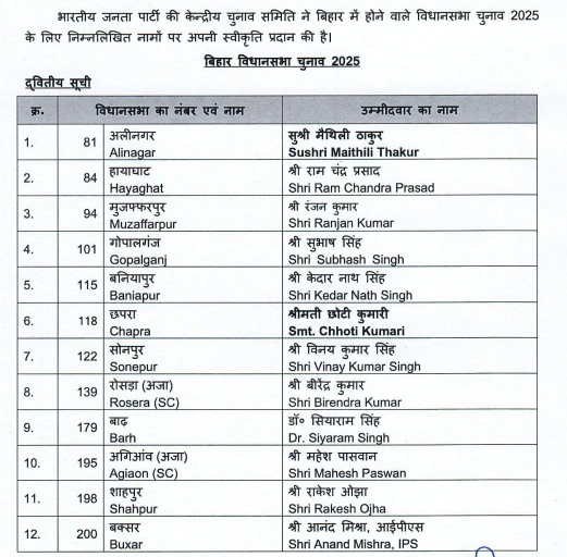Bihar Assembly Elections 2025 : BJP ने जारी की उम्मीदवारों की दूसरी सूची…! मैथिली ठाकुर और पूर्व IPS को मिला टिकट…किसका कटा टिकट…यहां देखें