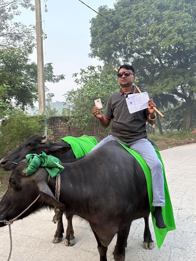 बिहार, 06 नवंबर। Bihar Election Voting Update : बिहार विधानसभा चुनाव 2025 के पहले चरण के मतदान में लोगों ने लोकतंत्र में भाग लेने का जोश दिखाया। इसी बीच एक अनोखी घटना देखने को मिली, जब RJD के एक नेता भैंस पर सवार होकर मतदान केंद्र पहुंचे।