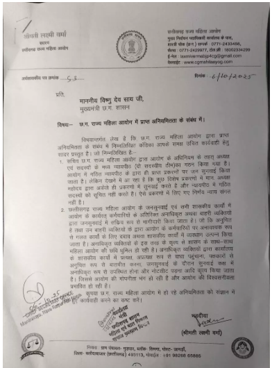 राज्यपाल को सौंपे गए शिकायती पत्र में सदस्यों ने आरोप लगाया कि महिला आयोग जैसे संवैधानिक संस्थान में संविधान के अनुरूप कार्य नहीं हो रहा है। उन्होंने गंभीर आरोप लगाते हुए कहा कि, प्रोसिडिंग में बाहरी व्यक्ति का हस्तक्षेप होता है। दो वकील और दो काउंसलर को अनावश्यक रूप से बैठा कर रखते हैं। राज्य महिला आयोग संवैधानिक पद पर है। फिर भी उनके चेंबर में राष्ट्रपति और प्रधानमंत्री की फोटो नहीं है। उनकी जगह पर वहां सोनिया गांधी और भूपेश बघेल के फोटो लगा हुआ है। सुकमा में एक जन सुनवाई अब तक नहीं हुई है।