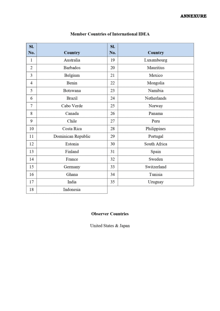 1995 में स्थापित International IDEA एक अंतर-सरकारी संगठन है, जो विश्वभर में लोकतांत्रिक संस्थाओं, चुनावी प्रक्रियाओं और सुशासन को मजबूत करने के लिए कार्य करता है। वर्तमान सदस्य 35 देश। पर्यवेक्षक देश संयुक्त राज्य अमेरिका और जापान