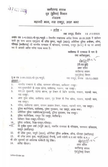 CG IPS Posting: IPS Umesh Gupta's appointment cancelled! Udit Pushkar now becomes the Governor's aide-de-camp... replacing Sunil Sharma.CG IPS Posting