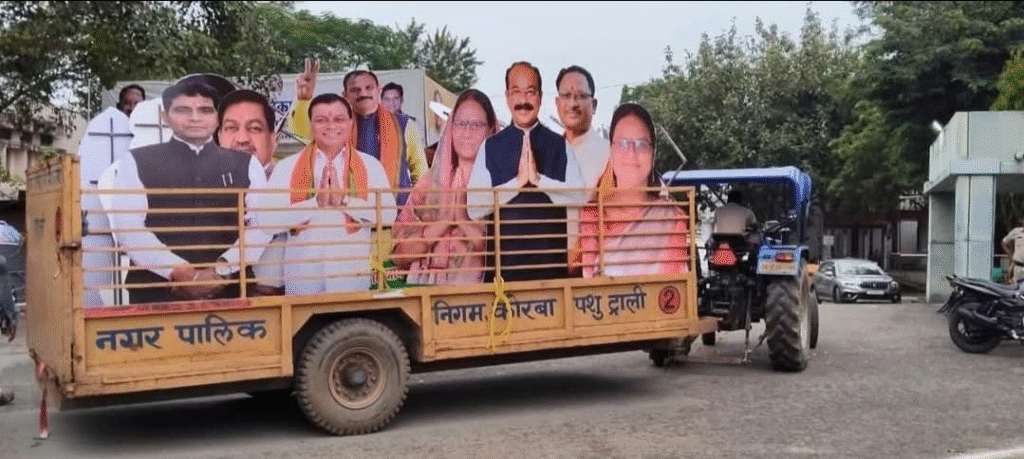 दरअसल, राज्योत्सव की तैयारी के लिए नगर निगम ने मुख्यमंत्री, मंत्रियों और महापौर के कटआउट्स को ढोने के लिए पशु ट्राली का इस्तेमाल किया। इस पूरे घटनाक्रम की तस्वीरें सोशल मीडिया पर वायरल होने के बाद राजनीतिक गलियारों में हड़कंप मच गया।