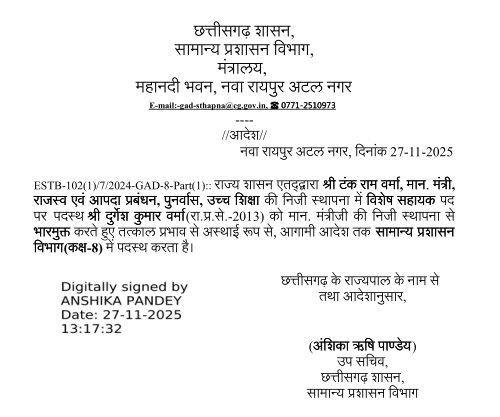 बता दें कि, टंक राम वर्मा वर्तमान में राजस्व, आपदा प्रबंधन, पुनर्वास और उच्च शिक्षा जैसे विभागों के प्रभारी मंत्री हैं। दुर्गेश कुमार वर्मा पहले उनकी निजी स्थापना में विशेष सहायक (OSD / Private staff) के रूप में थे। यह आदेश अचानक जारी हुआ, और इसे तत्काल प्रभाव से भारमुक्त कहा गया है, यानी अब वे उस निजी स्थापना-पद पर नहीं रहेंगे।