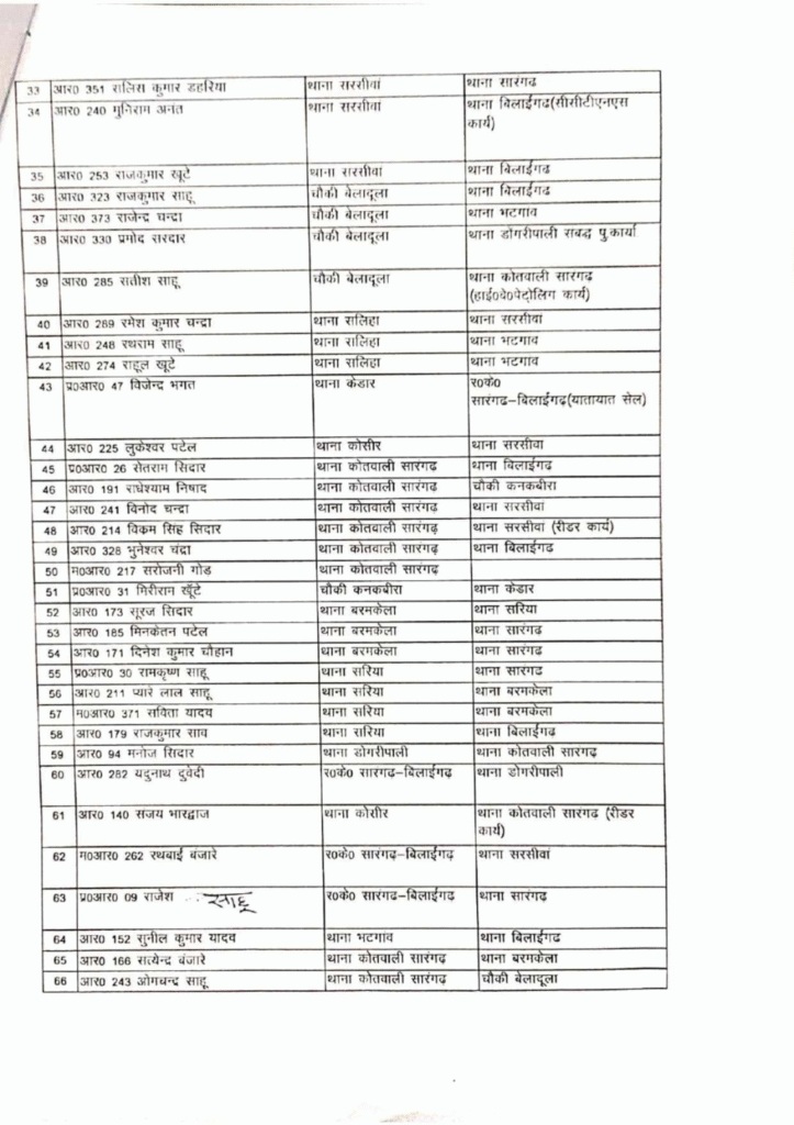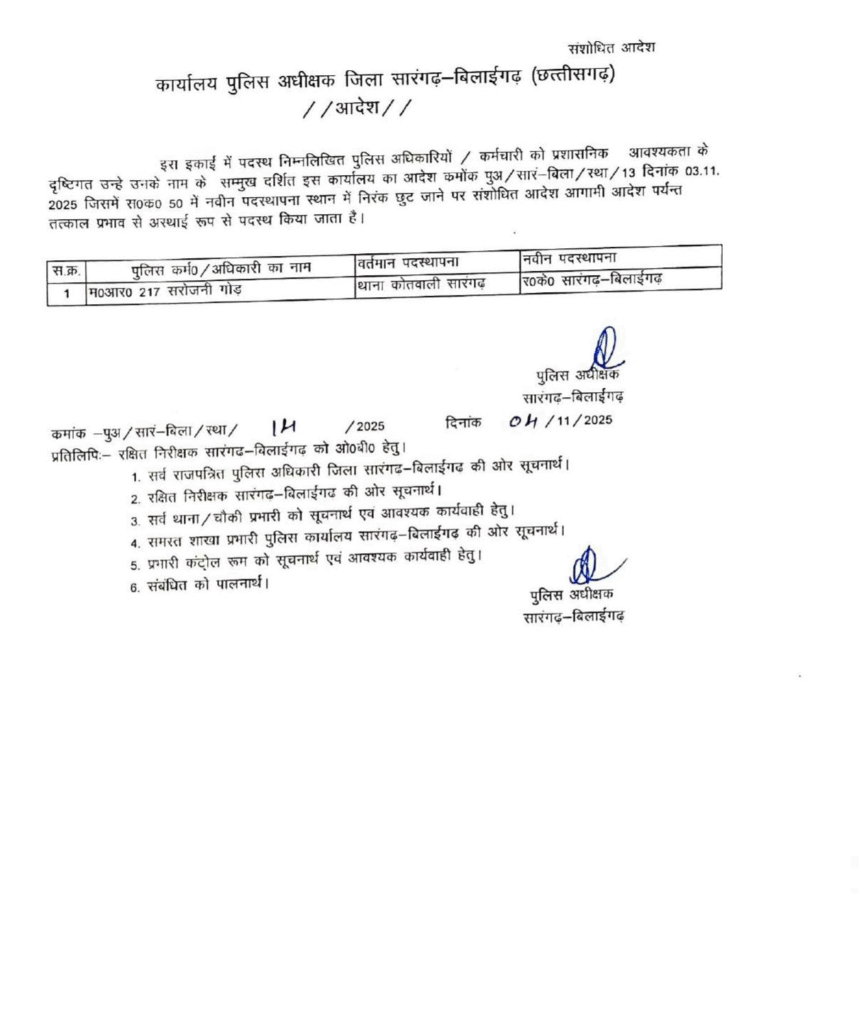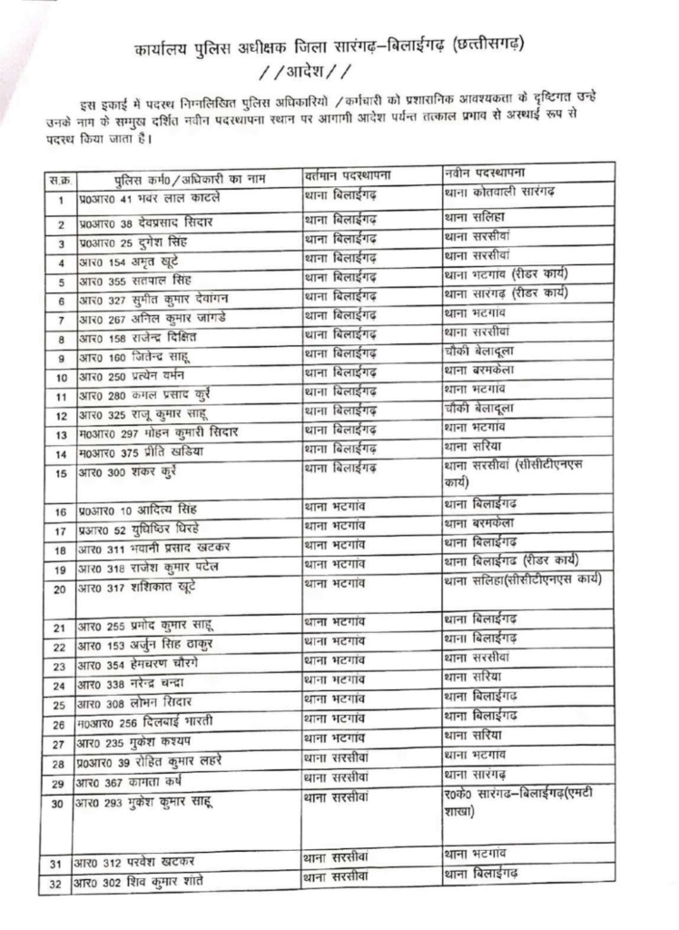 Police Transfer : सारंगढ़–बिलाईगढ़ में पुलिस विभाग में बड़ा फेरबदल…! 80 पुलिसकर्मियों का तबादला…यहां देखें List