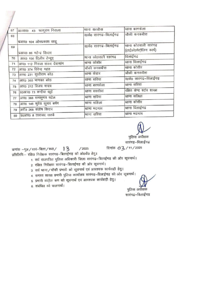सारंगढ़–बिलाईगढ़, 04 नवंबर। Police Transfer : सारंगढ़–बिलाईगढ़ जिले में एक बार फिर पुलिस विभाग में बड़े पैमाने पर तबादले किए गए हैं। पुलिस अधीक्षक (SP) कार्यालय से जारी आदेश के अनुसार, कुल 80 पुलिस कर्मियों का स्थानांतरण किया गया है। इनमें प्रधान आरक्षक (Head Constable) और आरक्षक (Constable) स्तर के अधिकारी शामिल हैं।
