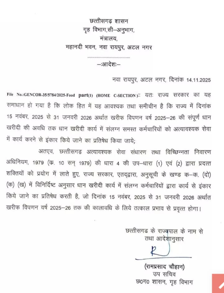 हड़ताल से निपटने और खरीदी प्रक्रिया को बाधित होने से बचाने के लिए राज्य सरकार ने कर्मचारियों पर एस्मा (ESMA) लागू कर दिया है। गृह विभाग ने इस संबंध में आधिकारिक आदेश जारी कर दिया।