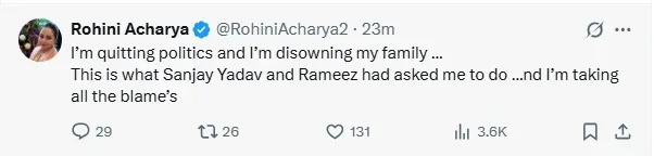 रोहिणी ने सोशल मीडिया पर लिखा, मैं राजनीति छोड़ रही हूं और अपने परिवार से नाता तोड़ रही हूं…संजय यादव और रमीज ने मुझसे यही करने को कहा था…और मैं सारा दोष अपने ऊपर ले रही हूं।