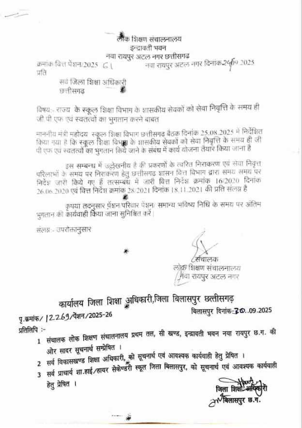 रायपुर, 01 सितंबर। Retirement Benefits : छत्तीसगढ़ लोक शिक्षण संचालनालय (DPI) ने स्कूल शिक्षा विभाग के शासकीय सेवकों के लिए एक महत्वपूर्ण निर्णय लिया है। नए निर्देशों के तहत अब विभागीय शिक्षकों और कर्मचारियों को सेवा निवृत्ति (रिटायरमेंट) के समय ही उनके सामान्य भविष्य निधि (GPF) और अन्य परिलाभों का भुगतान सुनिश्चित किया जाएगा।