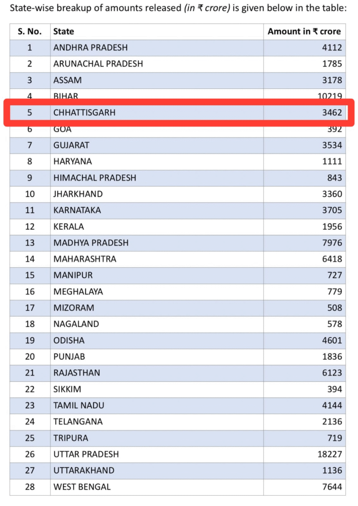 Tax Transfer Relief : मोदी सरकार ने खोला खजाना…! छत्तीसगढ़ को कर हस्तांतरण में भारी राहत…केंद्र ने दिए ₹3,462 करोड़…CM ने जताया आभार…शेष 27 राज्यों की List यहां देखें